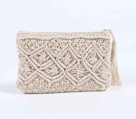 Handarbeit zum Verlieben: Unser Makramee-Baumwollbeutel mit Charakter. Spüren Sie die Qualität der kunstvollen Knoten und des detailreichen Mustern bei diesem handgefertigten Stück (ca. 19x13x2.5 cm [Masse prüfen!]). Ideal als elegante Kosmetiktasche, stilvolles Etui oder kleine Clutch für besondere Anlässe. Ein vielseitiger und einzigartiger Begleiter im Boho-Stil, der die Schönheit von Handwerkskunst in Ihren Alltag bringt.
